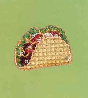 The Taco kit includes all Mill Hill Glass Beads, Mill Hill Treasures, Mill Hill Perforated Paper, magnet, and floss needed to complete the stitched project