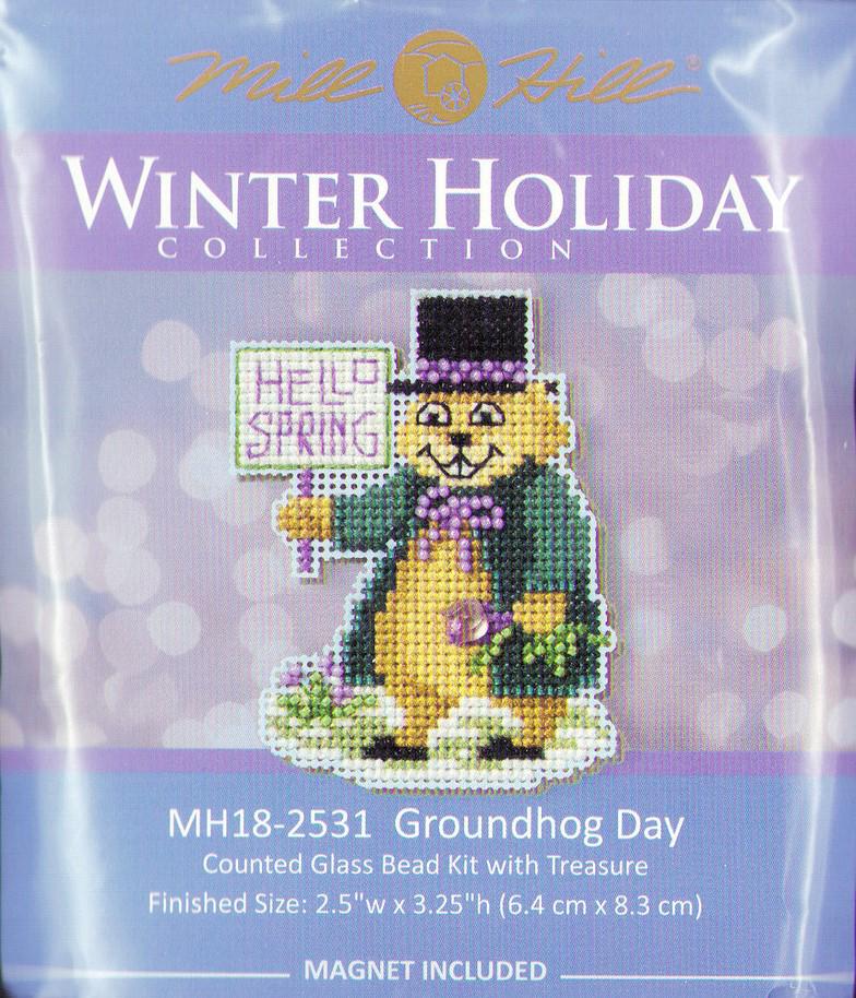 Groundhog Day Mill Hill Winter Holiday 2025 beaded cross stitch kit. Kit includes Mill Hill perforated paper, Mill Hill glass beads, Mill Hill treasure, magnet, floss, needles, chart and complete instructions.