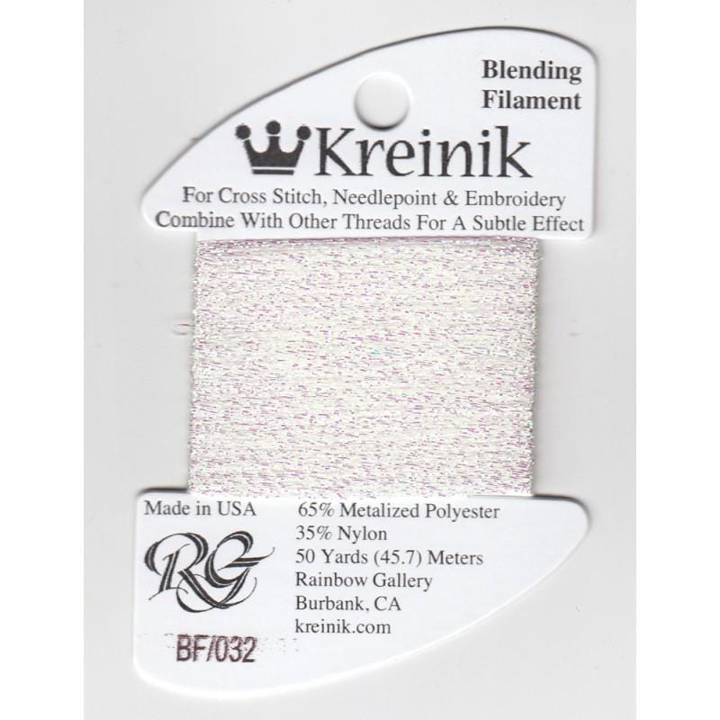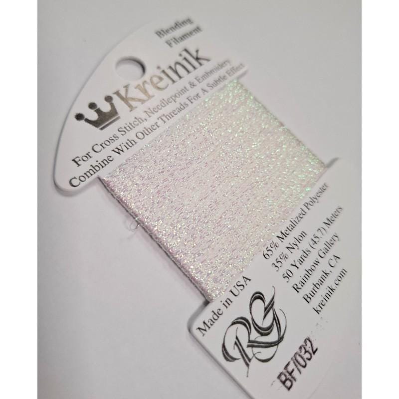 This is the thinnest metallic (similar to tinsel on a Christmas tree) offering the most subtle effect. Use Kreinik Blending Filament, by itself or combined with other yarns, to create random highlighting effect in any design. Available in different effects/finishes: