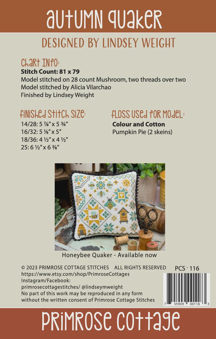 Primrose Cottage Stitches ~ Christmas Quaker ~ counted cross stitch pattern / chart designed by Lindsey Weight. Model stitched on 28ct Mushroom (aka light Mocha) from Zweigart #3281, two threads over two using one color Colour and Cotton - Pumpkin Pie ( 2 skeins )