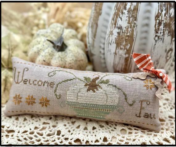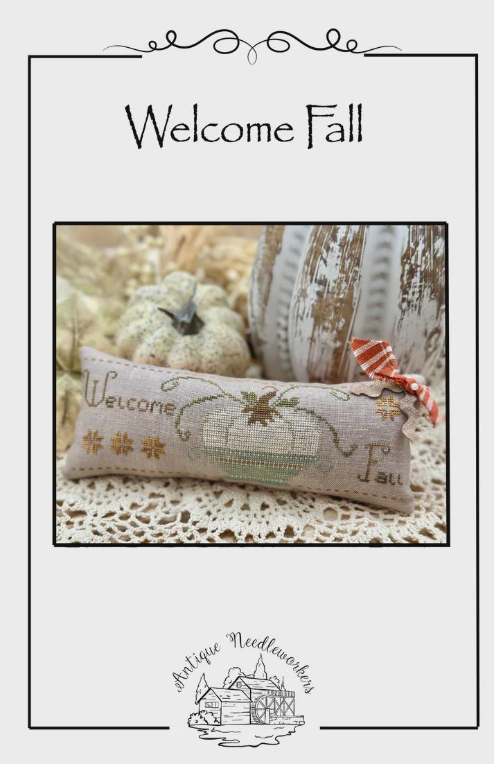 New Antique Needleworkers counted cross stitch pattern ~ Welcome Fall ~ Printed pattern. Model stitched on 36ct Mason Linens Chatelaine Med-Dark using Gentle Arts and Weeks Dye Works threads ( DMC conversion listed )