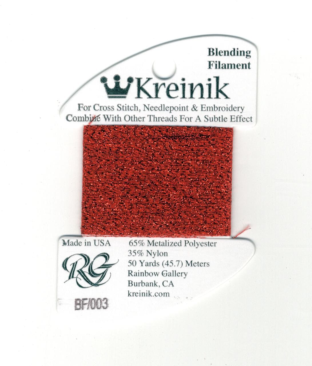 This is the thinnest metallic (similar to tinsel on a Christmas tree) offering the most subtle effect. Use Kreinik Blending Filament, by itself or combined with other yarns, to create random highlighting effect in any design. Available in different effects/finishes: