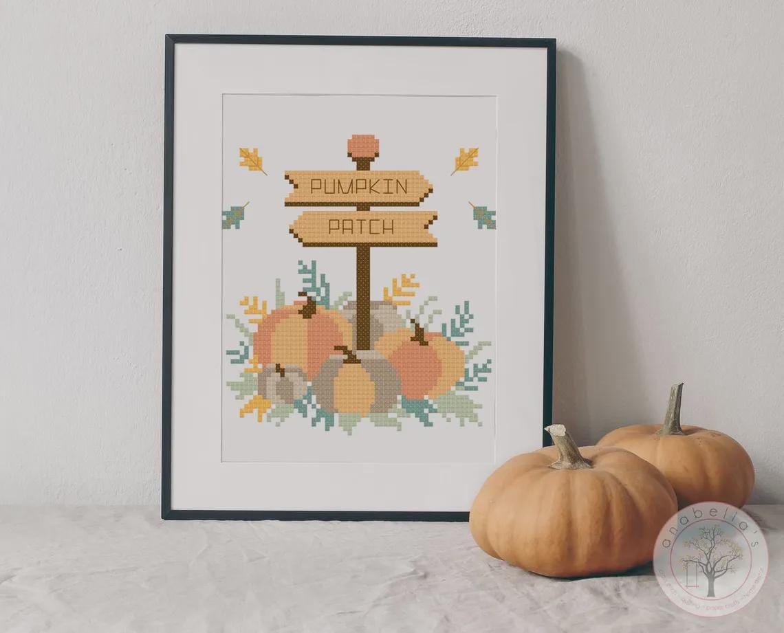 Pumpkin Patch counted cross stitch patter by Anabella's. Model stitched using DMC floss on 16ct Antique White Aida fabric