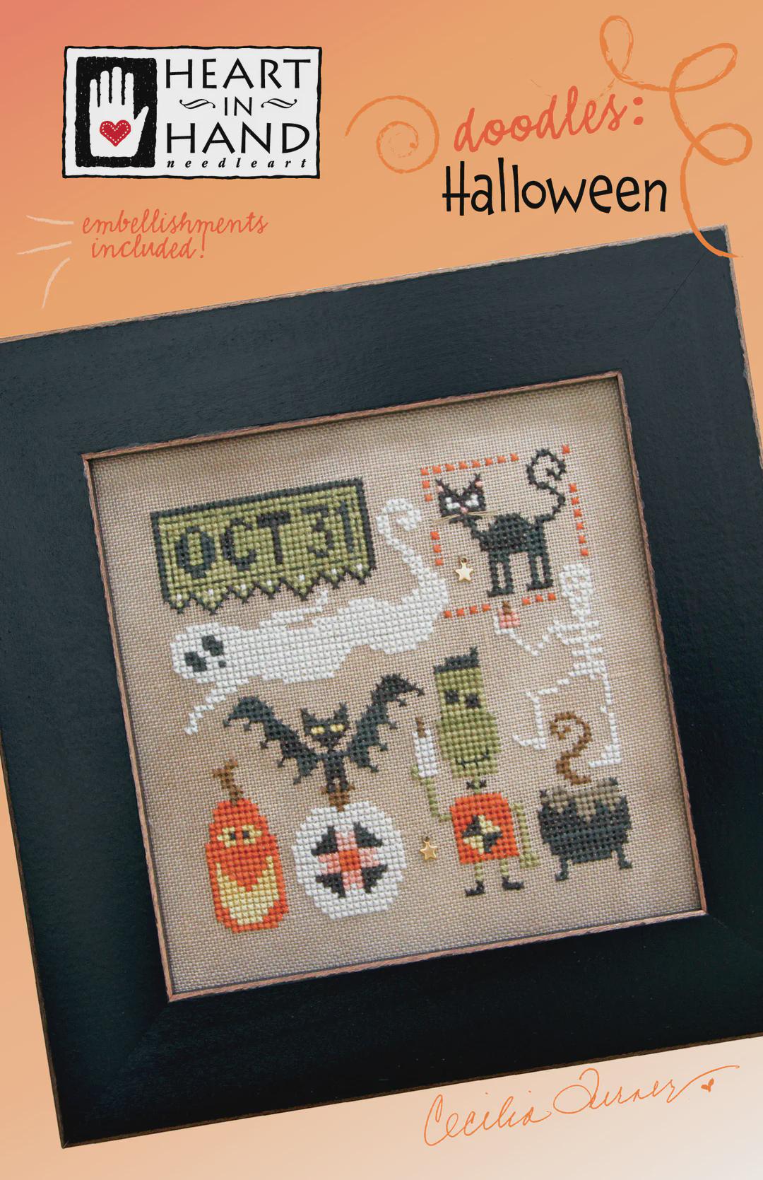 Heart in Hand counted cross stitch pattern Doodles: Halloween with embellishment beads. Printed hardcopy pattern