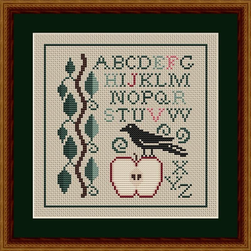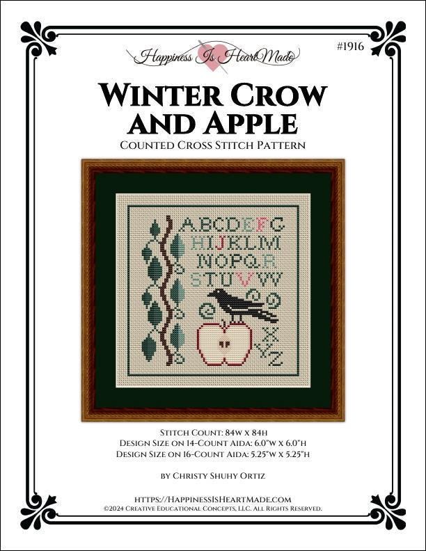 The Winter Crow and Apple cross stitch pattern is an alphabet design with a cute winter crow. This design has a green and pink alphabet, along with a crow standing on an apple, with an apple tree branch along the side of the design. This design is the third in a series. The first pattern is Summer Crow And Watermelon, and the second is Autumn Crow and Pumpkin. The last chart for Spring has not been released yet. This chart is done in black and white symbols. The design uses only whole stitches (no backstitching). Stitch Count: 84w x 84h. Design Size on 14-Count Aida: 6.0"w x 6.0"h. Design Size on 16-Count Aida: 5.25"w x 5.25"h. The Thread Color Key lists DMC thread colors.