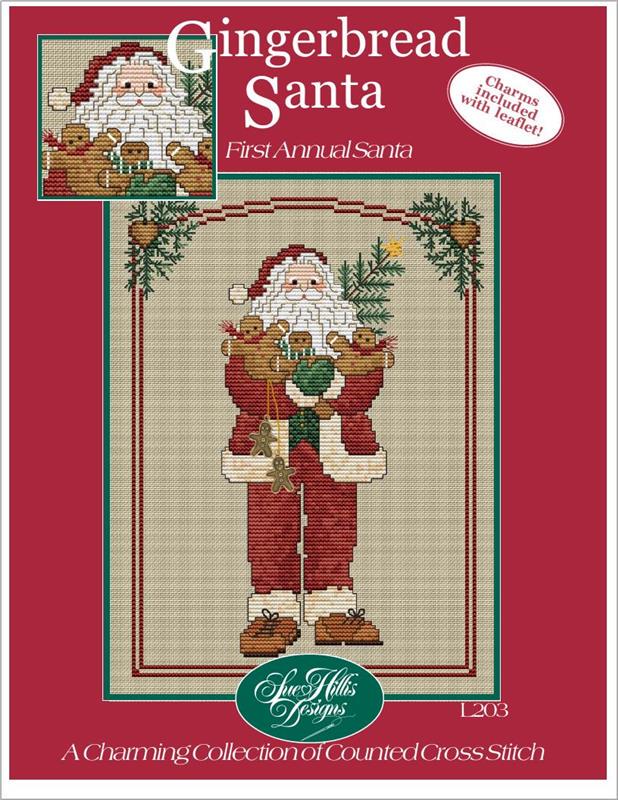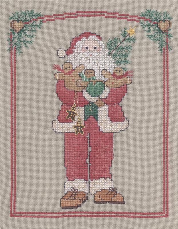 Gingerbread Santa is the first in an annual series of twelve Santas! This "charmer" comes with two shiney gold toned gingerbread charms to drape on a gold cord over Santa's arm, already full of gingerbread cookies! Fun to stitch from a clear concise chart