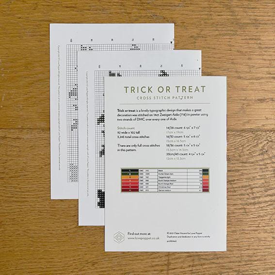 Trick or Treat counted cross stitch pattern by Love Poppet. Model stitched on 14ct Pewter Aida (718) from Zweigart using DMC floss. The pattern uses full cross stitches only