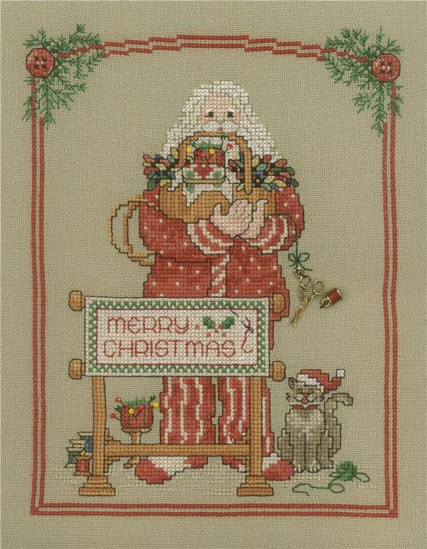 The fourth in the Annual Santa series, Stitching Santa is ready for a night of stitching with arms full of needlework goodies! Chart includes gold toned scissors and spool charms.