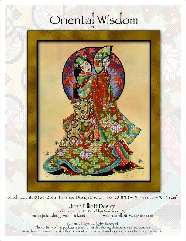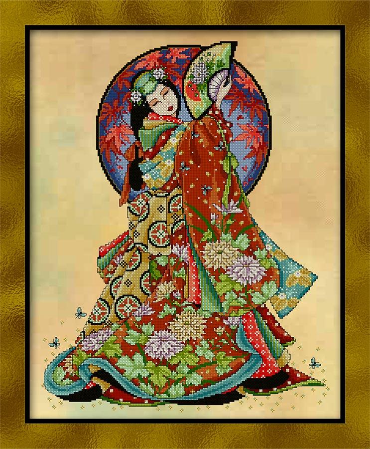 An elegant Geisha in her finest embroidered kimono. This chart is printed in black & white symbols with colored backstitch. Suitable for Aida or Evenweave.
