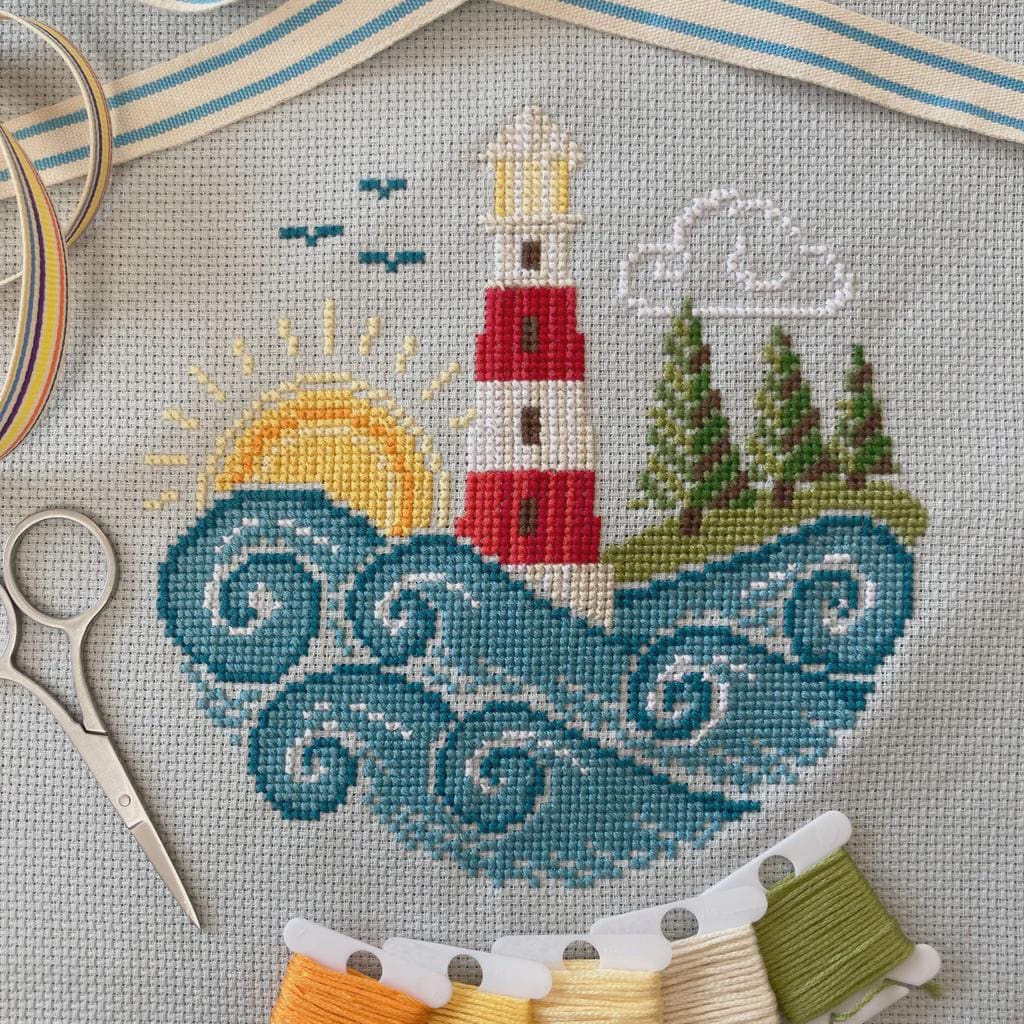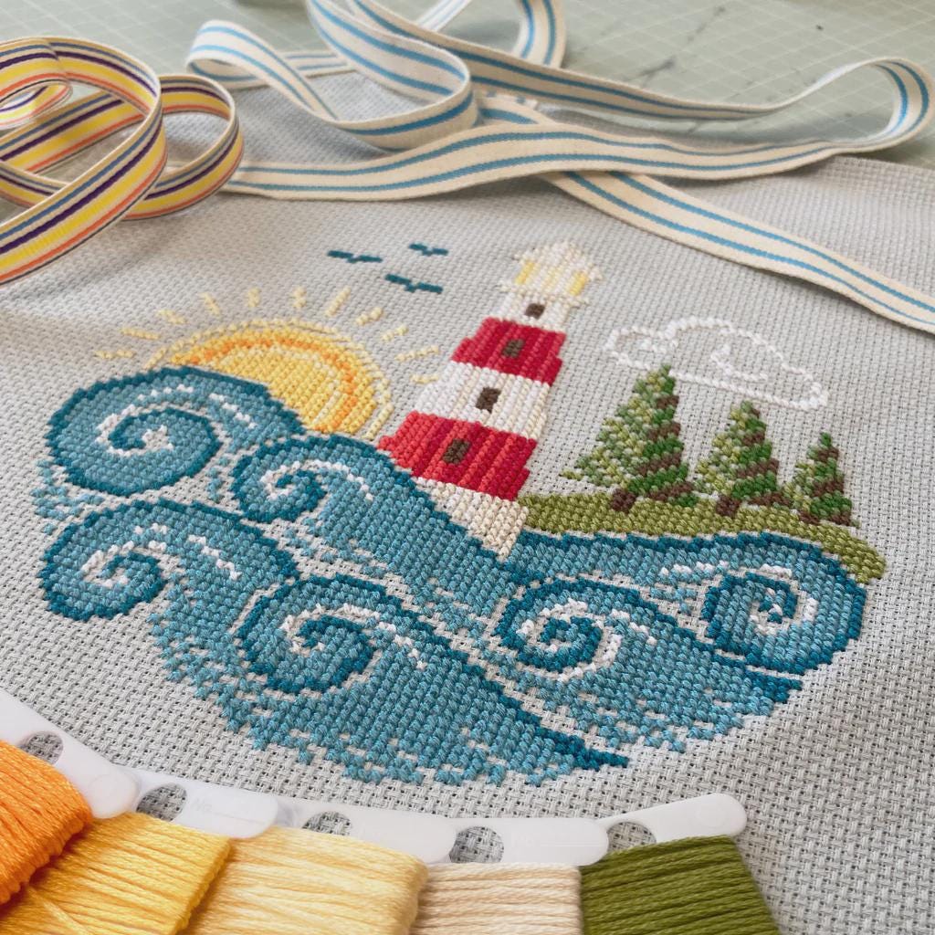 Going Coastal counted cross stitch pattern from Love Poppet. Printed paper pattern. Model stitched on 14ct Grey Blue Aida using DMC floss.
