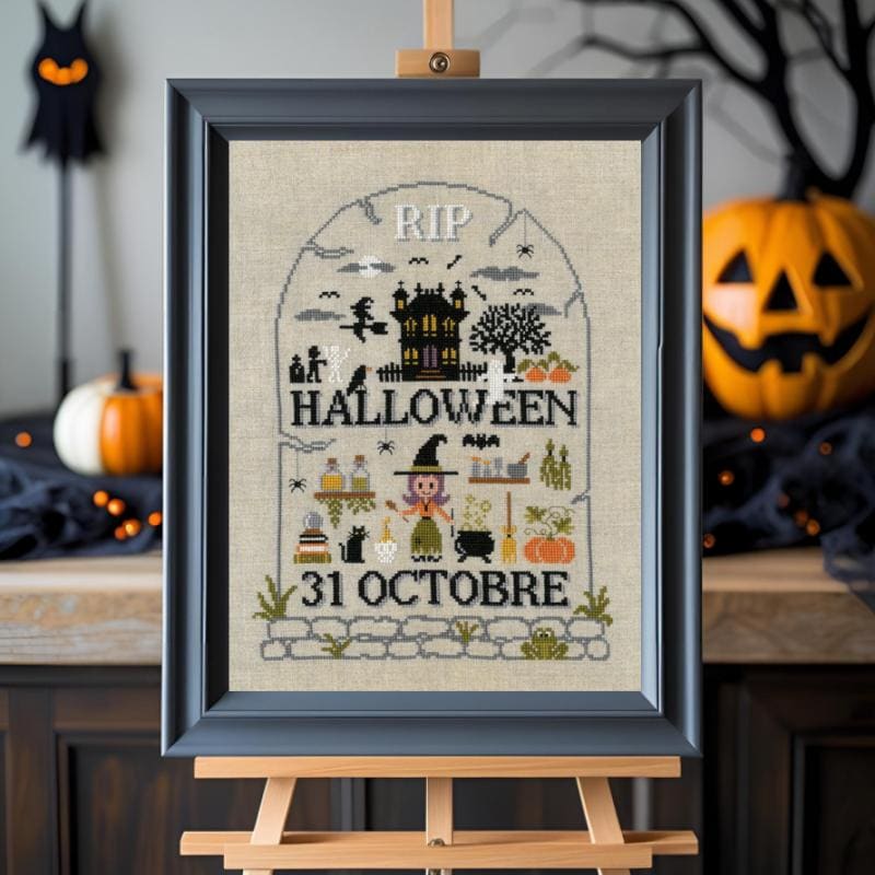 RIP Halloween counted cross stitch pattern from Jardin Prive. Model stitched on Belfast linen fabric 32ct by Zweigart Flax color ref. 3609/52 with 2 strands over 2 threads using DMC floss.