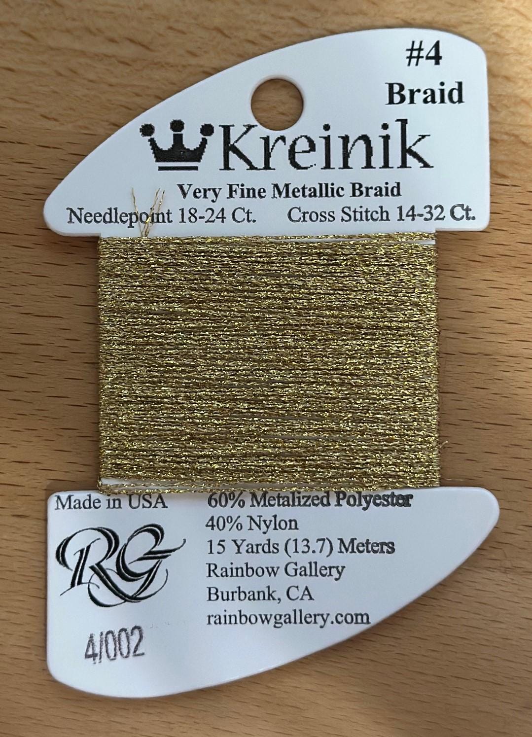 Thin metallic Braid used for needlework; primarily cross stitch and embroidery, plus blending in needlepoint. Very Fine #4 Braid is half the thickness of Fine #8 Braid.