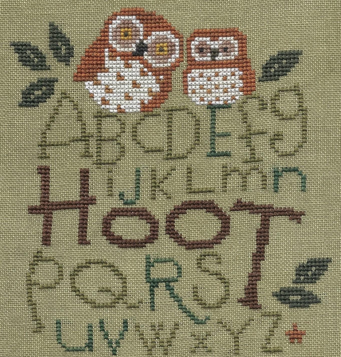 Hoot by Bent Creek counted cross stitch pattern. Model stitch on Weeks Dye Works 30ct Putty using Weeks Dye Works, The Gentle Art and DMC floss / threads. Stitch count: 82 x 88
