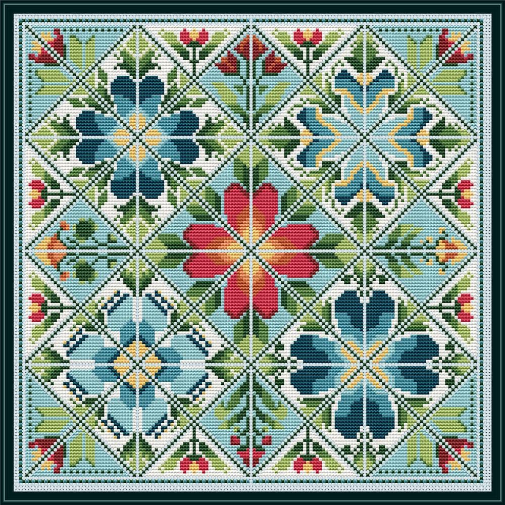 A full stitch quilt and floral inspired design that finishes at 147w x 147h. Not quite full coverage with fabric color peeking through between blocks and at the edges. Charted with 12 DMC colors.