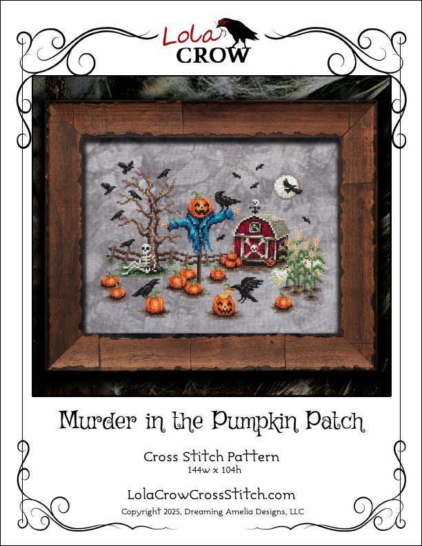 A murder of crows has descended upon a haunted pumpkin patch. Full color chart.