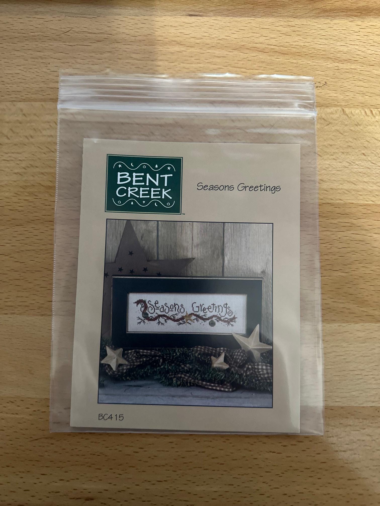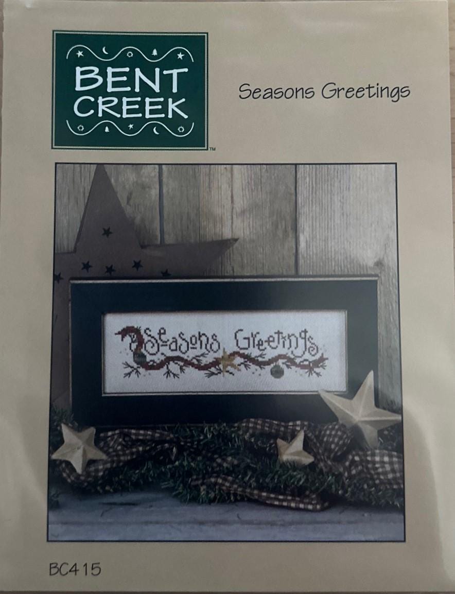 Seasons Greetings by Bent Creek counted cross stitch pattern. Model stitch on Weeks Dye Works 33ct Liberty Gathering Grey from R & R Reproductions using Weeks Dye Works threads / floss ( DMC alternates listed ) Stitch count: 129 x 32