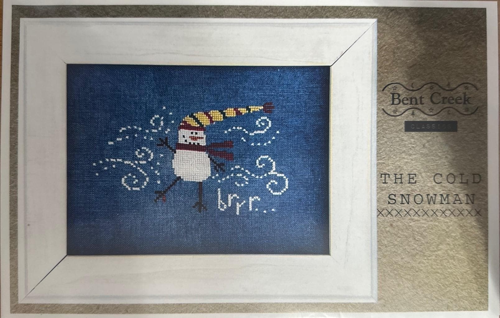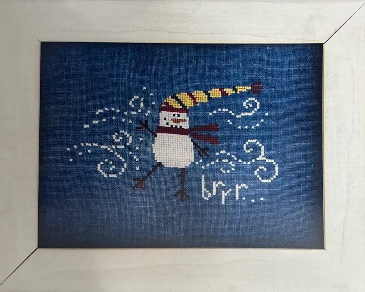 The Cold Snowman counted cross stitch pattern by Bent Creek. Model stitched on 32ct Wee Freedom Linen using The Gentle Art threads ( DMC alternates listed )