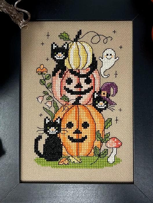 Make this small Halloween design with fall leaves, mushrooms, a ghost, and a stack of pumpkins with black cats peeking out.
