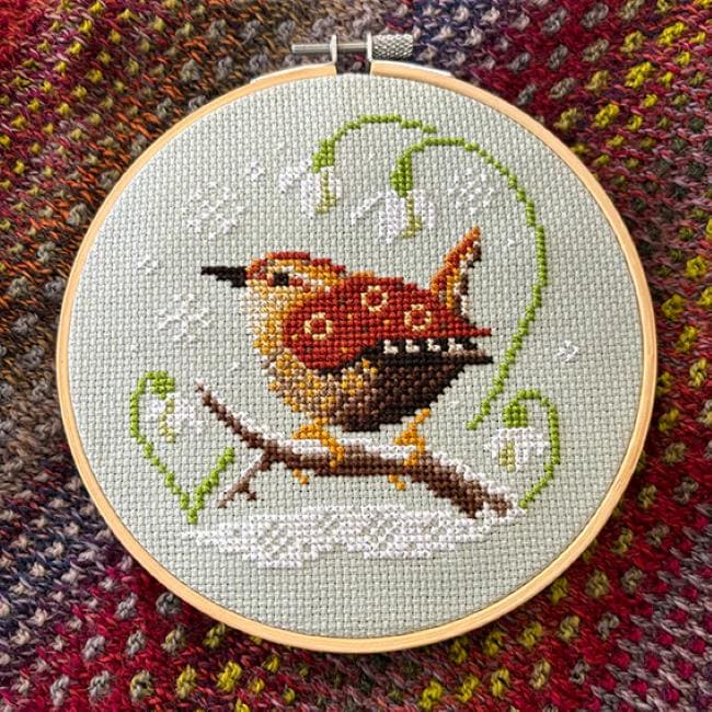 Wren & Snowdrops counted cross stitch pattern by Love Poppet. Model stitched on 14ct Celadon Green Aida from Zweigart using DMC floss. Pattern uses only full cross stitches